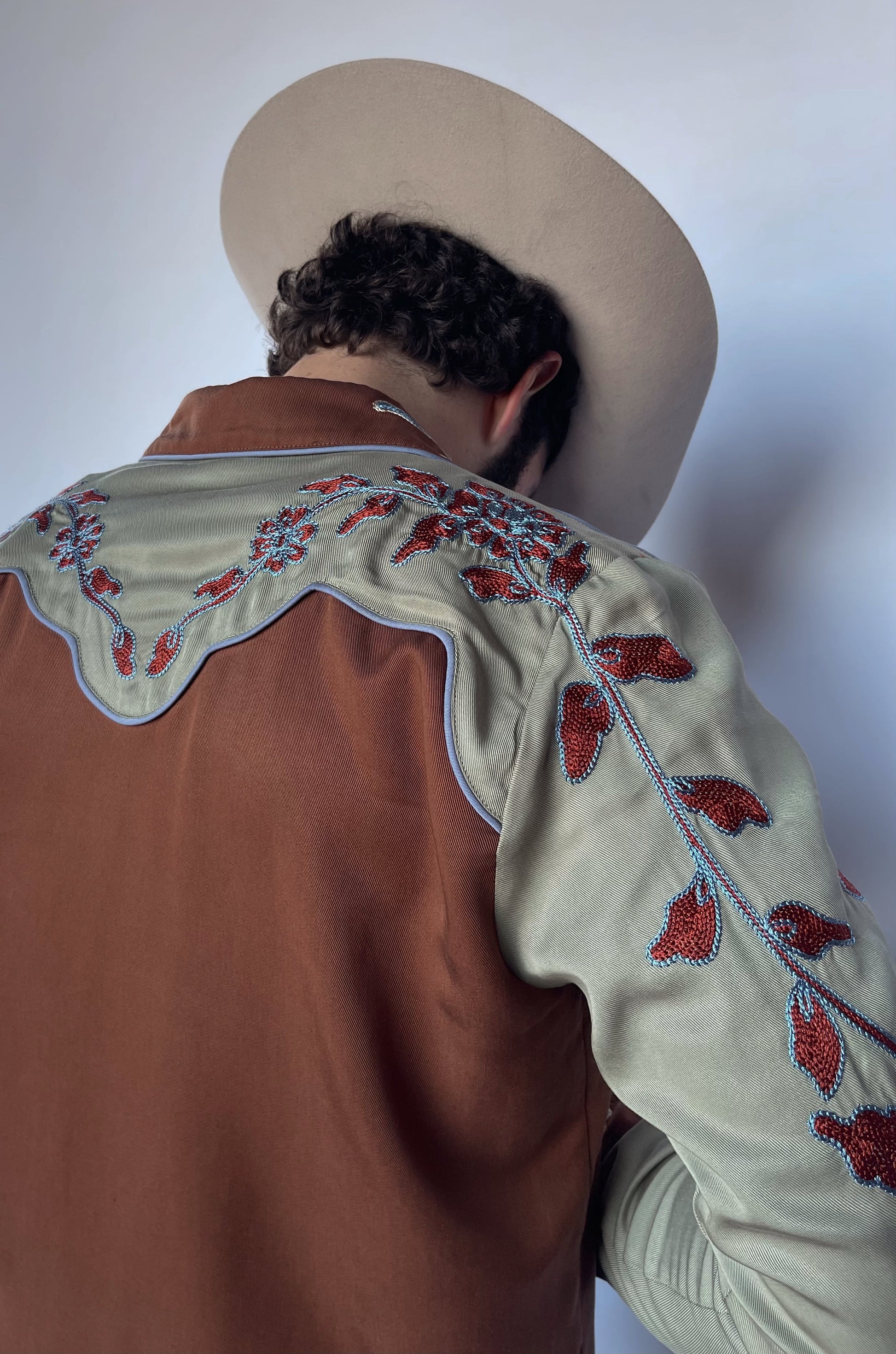 The San Antonio shirt is a stunning homage to the classic rodeo shirt, blending vintage Western aesthetics with intricate embroidery. Its striking combination of earthy brown and sage green, adorned with elaborate floral embroidery in shades of blue and red. The yoke and sleeves are decorated with Western-style piping and arrow details, reinforcing its timeless cowboy appeal. Finished with pearl snap buttons and a sharp collar, the San Antonio embodies the spirit of classic rodeo wear while maintaining a refined, fashion-forward edge. Perfect for those who appreciate heritage Western style with a modern flair.