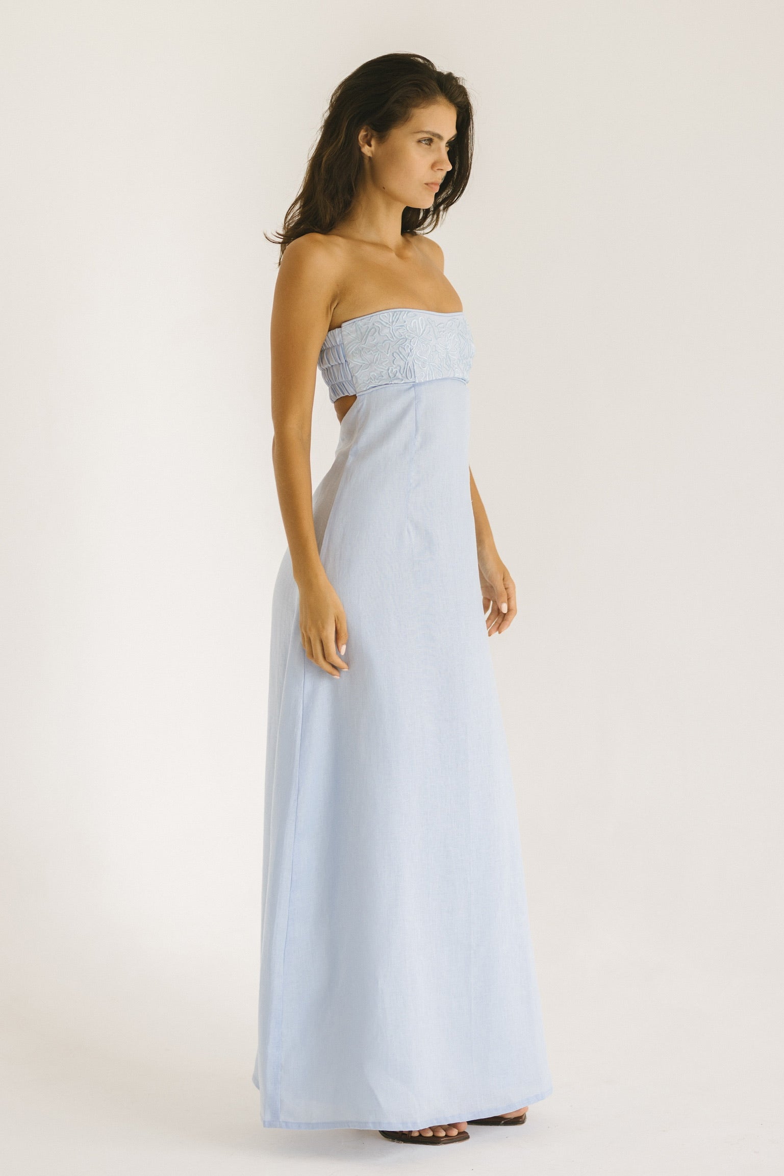 Our Bustier Gown is effortlessly elegant, designed with a darted bodice for a close fitting waist that falls into a relaxed hem. This piece is decorated with our exclusive Sofia Embroidery, and crafted from 100% linen.